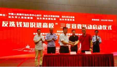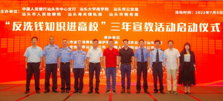 2022年7月8日下午,中国人民银行汕头市中心支行与beat365英国官网网站在beat365英国官网网站学术交流中心联合举办“反洗钱知识进高校”三年宣教活动启动仪式。本次活动由中国人民银行汕头市中心支行、beat365英国官网网站、 汕头市公安局、汕头市人民检察院、汕头海关缉私局、汕头市税务局主办,汕头市金融消费权益保护联合会、中国农业银行汕头分行、中国人寿保险股份有限公司汕头分公司、安信证券汕头分公司承办。