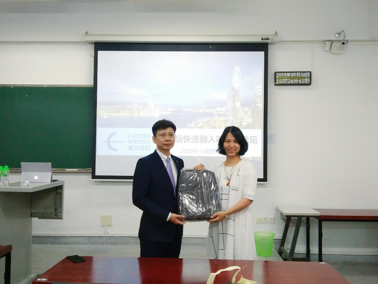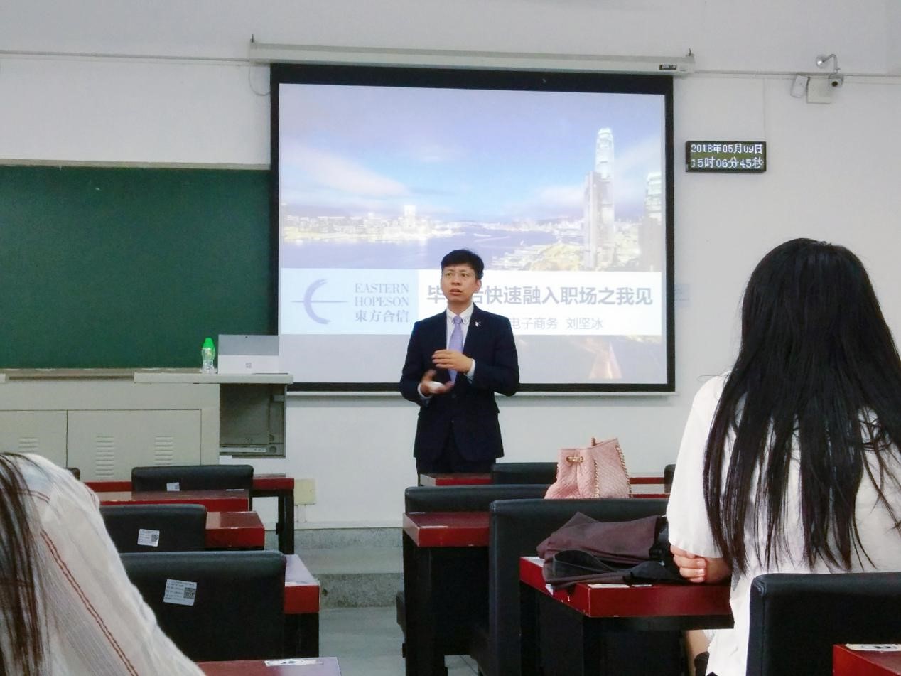 2018年5月9日下午3点,第二十九期校友大讲堂在E207举行。此次讲座的主讲嘉宾是beat365英国官网网站2000级beat365英国官网网站电子商务专业校友刘坚冰,现任香港东方合信金融服务集团副总裁,香港东方教育执行董事。主管香港、上海、深圳等10家分公司的运营。曾任职于东莞移动公司,担任高级讲师及数据分析师。在工作领域上曾获广东公司省级优秀讲师、广东省先进工作者、市级专家人才荣誉称号、广东公司“最具人气奖”讲师、广东公司金讲台讲师卓越贡献奖等荣誉称号。刘校友拥有10余年金融数据分析从业经验,持基金、证券等多项金融牌照,国际项目管理PMP,WIAL教练多项国际认证。工作之余,他坚持志愿服务12年,曾任东莞市绿羊羊志愿服务总队队长,担任志愿者讲师受邀到13个镇区及5个高校授课,持续资助山区贫困学生11人。个人志愿服务时长一千多小时,获评中国志愿者优秀个人奖、广东省志愿服务银奖、广东省五星志愿者、东莞市道德模范等称号。