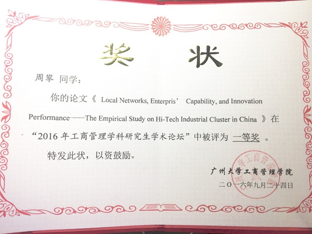 beat365官网研究生黄舟骋、周攀参加了本次论坛,周攀的投稿论文《Local Networks, Enterpris’ Capability, and Innovation Performance——The Empirical Study on Hi-Tech Industrial Cluster in China》被评为一等奖。