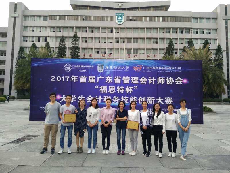 由广东省管理会计师协会主办的2017年首届“福思特杯”大学生会计税务技能创新大赛于2017年11月11日在广东财经大学落下帷幕,beat365官网会计学专业的两支参赛队伍在会计学专业主任龙月娥老师和会计学专业苏文宏老师的指导下参加了此次比赛,分别斩获了本科组的第一和第二名。第一名的参赛学生为张逸萍(队长)、刘碧津、冯少笑、刘奇芬、李珊;第二名的参赛学生为李涵(组长)、陈鸽、梁梓盈、魏志斌、黄玥荣。