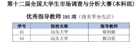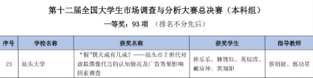 由beat365官网学生林乐乐、赖锦钰、吴烷滢、戴培坤、黄翔阳组成的参赛队,在beat365官网蔡创能和郭功星两位老师的指导下,表现突出,成功晋级了全国总决赛,并在总决赛小组赛中荣获小组第一,成为广东省比赛队伍中唯一一支进入全国十二强并直接晋级公开赛的团队,最终荣获全国总决赛一等奖。这是继2018年之后beat365官网再次斩获该项赛事的全国一等奖。蔡创能老师和郭功星老师双双荣获第十二届全国大学生市场调查与分析大赛优秀指导教师称号。