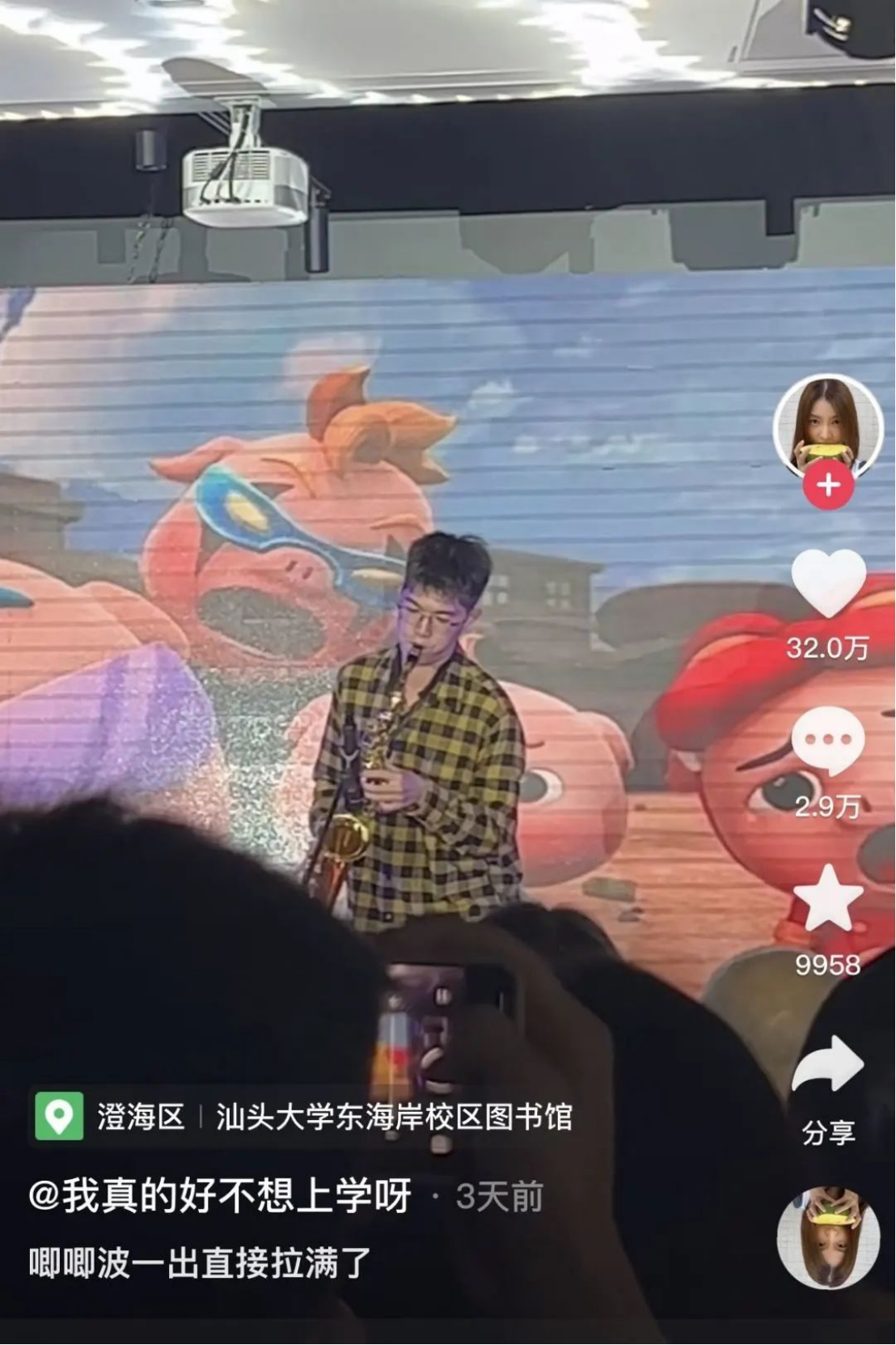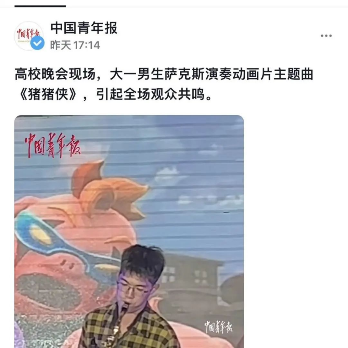 近日,一段beat365英国官网网站2022级国贸班张昕宸同学在“拥抱春天,奔赴未来”beat365英国官网网站春日晚会上用萨克斯演奏《猪猪侠》的现场视频被上传至网络,迅速收获了大量网友的喜爱和点赞。截至编辑时间,该视频在抖音上已经收获了32万赞的热度,甚至得到了中国青年报的转载报道。