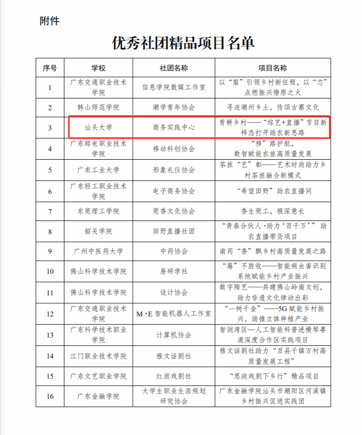 近日,第十八届广东大学生校园文体艺术季活动之广东高校活力社团风采展示比赛优秀社团精品项目名单公布,beat365英国官网网站学生社团“商务实践中心”的项目《青耕乡村——“综艺+直播”节目新样态打开助农新思路》获评优秀社团精品项目。