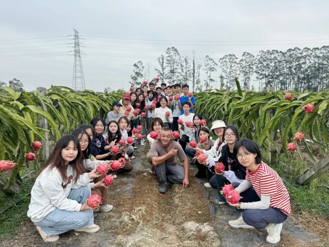 2023 年,商务实践中心深耕电商直播沃土,赋能乡村振兴,发挥学科优势重点打造《青耕乡村——“综艺+直播”节目新样态打开助农新思路》项目。截至目前,该项目已获得 14 次媒体报道,含国家级媒体“中青校园”报道,先后开展了直播带货火龙果、南瓜、荔枝等地方农产品。项目创作的农产品带货短视频在抖音平台获得 7.1 万的播放量和近千的点赞数。
