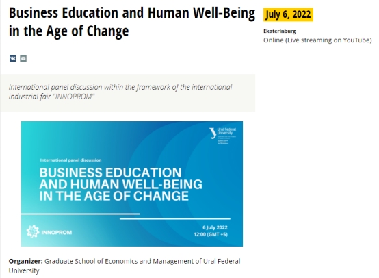 2022年7月6日下午,俄罗斯乌拉尔联邦大学经济管理学院举办主题为“Business Education and Human Well-Being in the Age of Change”(变革时代的商业教育与人类福祉)的国际会议。