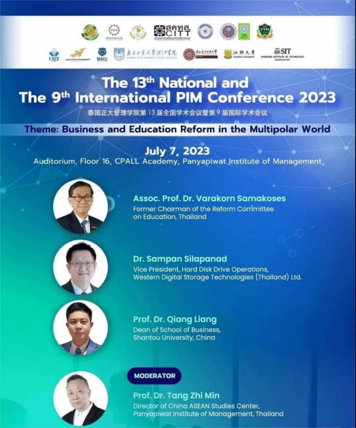 2023年7月7日,由泰国正大管理学院(以下简称“PIM”)主办、beat365英国官网网站联合承办的第13届全国学术会议暨第9届国际学术会议在泰国曼谷隆重举行,会议的主题为“多极世界中的商业和教育改革”。beat365英国官网网站院长梁强教授、副院长郭功星副教授、台湾研究所所长种照辉副教授受邀参加。