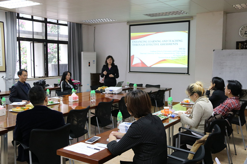 工作坊伊始,史杰教授分享了题为“Enhancing Learning and Teaching through Effective Assessments”的汇报。史杰教授是一位新加坡籍华人,目前就职于日本国立电气通信大学,她在新、日、中等国有逾30年的教师培训经验,理论丰富,讲课生动。在本次汇报中,她围绕“通过课程评估与考核,如何促进学习”的主题,首先讲解了学习(Learning)是如何发生的,教师如何在教(Teaching)的过程中考虑学生的“习得(Learning)”;其次,她介绍了教育学领域经典的Bloom’s Taxonomy(布鲁姆分类学)理论及其构成,以及教学(The Teaching Cycle)就是一个教(Teaching)、评估(Assess)、分析(Analyze)和汇报(Reports)的循环过程;接着,史老师以日本高校和美国高校的课程评估方法为例,讲解了形成性评价(Formative Assessment)和总结性评价(Summative Assessment)的不同,以及如何设计一门课程的考核方式。最后,史教授和在场老师亲切交流,沟通了如何提高学生学习动机、课程考核形式及成绩构成等问题,气氛活跃。