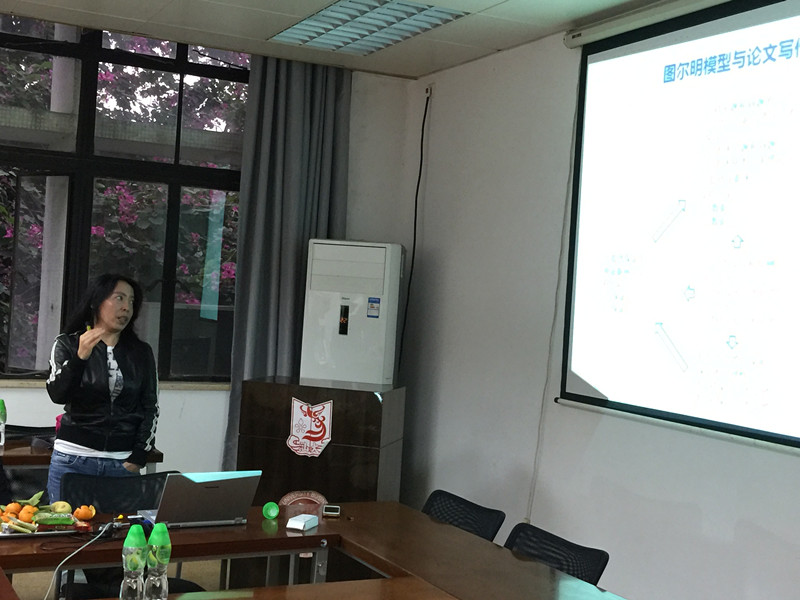 工作坊的第二部分,是都建颖副教授分享了“批判性思维指导下的学科教学探索”的汇报。都教授介绍了“批判性思维”与“图尔明模型”的理论内容,举例说明了“图尔明模型”在学科教学中的探索,以及为“学科教学植入批判性思维”提出了一些宝贵的建议。都教授语言通俗易懂,讲解生动,也亲切回答了老师的提问。
