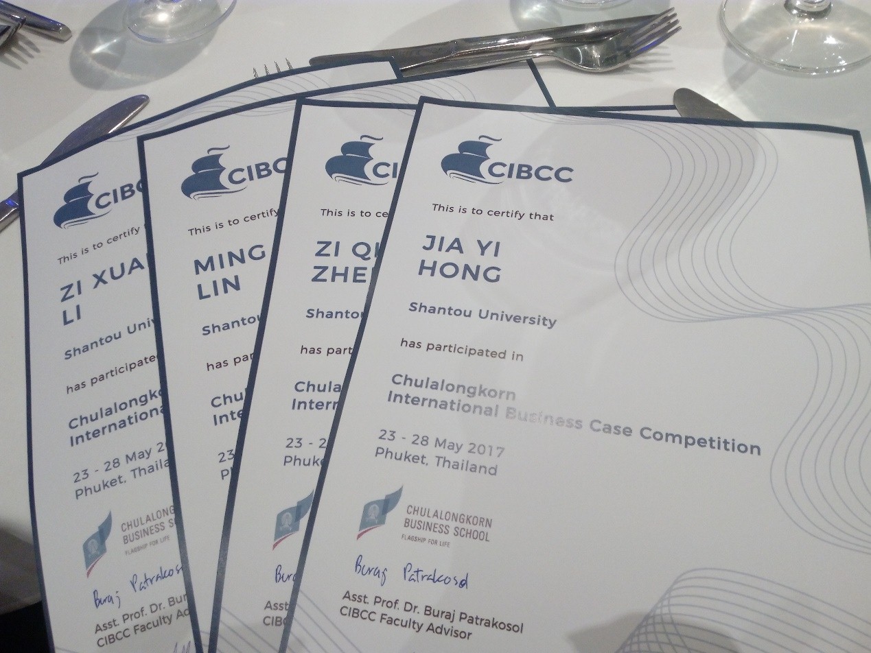 CIBCC 国际商业案例比赛(Chulalongkorn International Business Case Competition )由泰国最古老的大学,被尊为“全国最有威望的大学”的朱拉隆功大学举办,邀请来自新加坡、美国、加拿大、澳大利亚等世界各国的新加坡国立大学、新加坡管理大学、奥克兰大学、新南威尔士大学、明尼苏达大学、香港中文大学、蒙特利尔高等beat365英国官网网站、泰国国立政法大学等16支队伍参与竞赛。