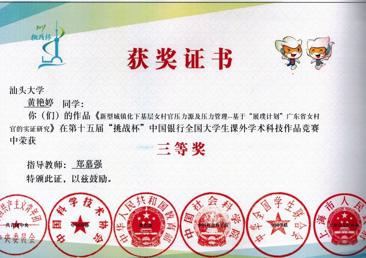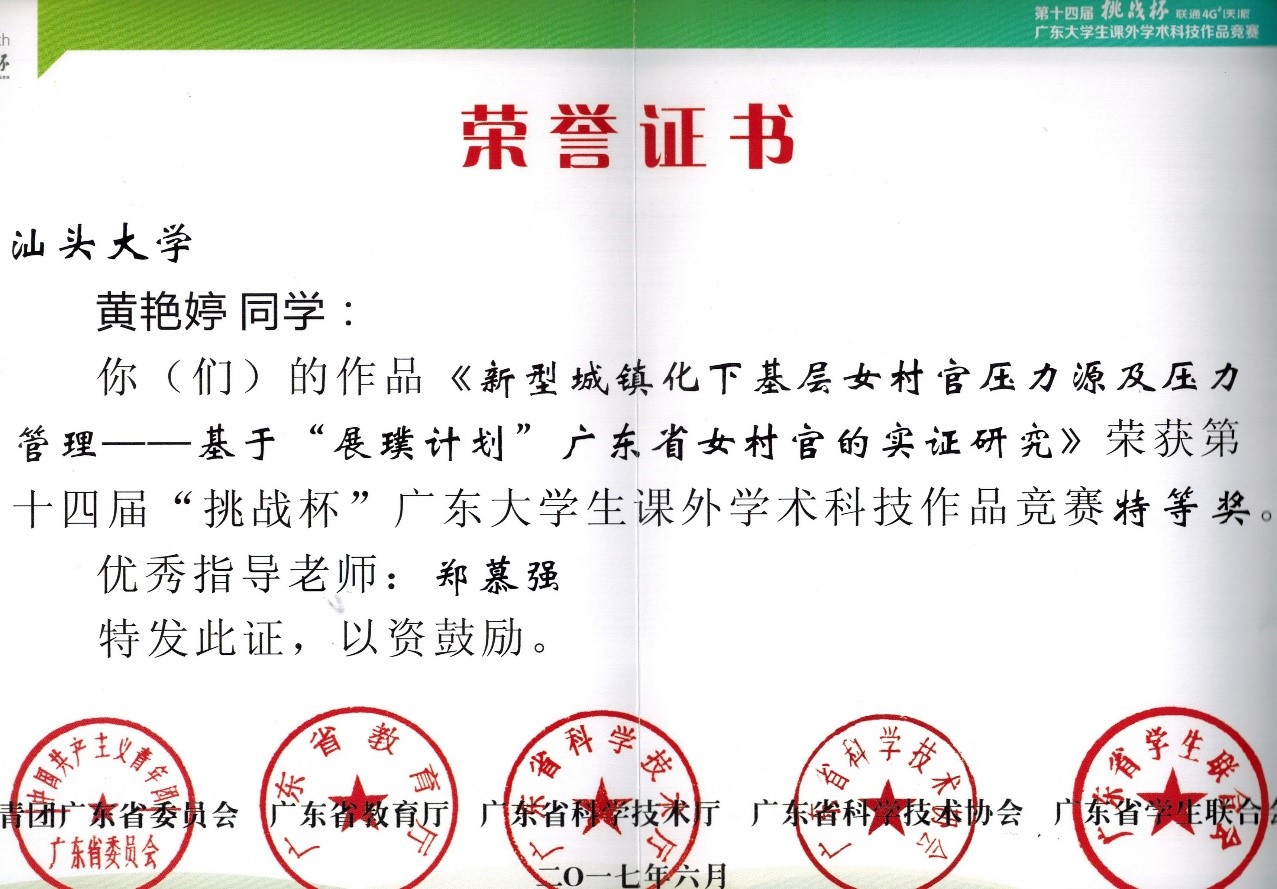 2017年,beat365官网14级市场营销同学黄艳婷分别参加了第十四届“挑战杯”广东大学生课外学术科技作品竞赛以及第十五届“挑战杯”全国大学生课外学术科技作品竞赛。其作品《新型城镇化下基层女村官压力源及压力管理--基于“展璞 计划”广东省女村官的实证研究》斩获了广东赛区特等奖以及全国赛区三等奖的优异成绩,这是近五年beat365英国官网网站在挑战杯中哲学社会科学类社会调查报告和学术论文中取得的最好成绩。