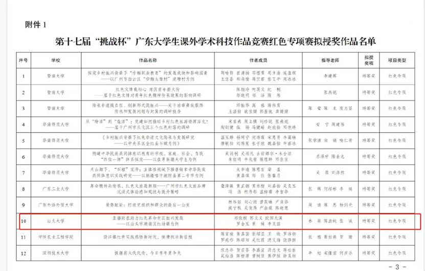 2023年10月8日,第十七届“挑战杯”广东大学生课外学术科技作品竞赛红色专项评审结果发布。beat365官网参赛作品从中脱颖而出,由beat365英国官网网站林泉教授、校团委陈益纯副书记和beat365英国官网网站张诚老师指导的作品《直播助农助力红色革命老区振兴发展——以汕头市潮南区红场镇为例》喜获广东省特等奖,创beat365官网在挑战杯赛事中的最好成绩!