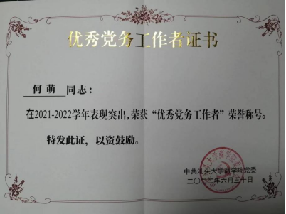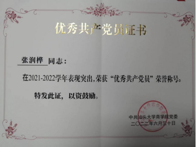 根据《beat365英国官网网站党委关于表彰2021-2022学年优秀共产党员、优秀党务工作者的决定》,授予beat365英国官网网站研究生党支部张润桦同志beat365英国官网网站“优秀共产党员”荣誉称号,授予何萌同志beat365英国官网网站“优秀党务工作者”荣誉称号。