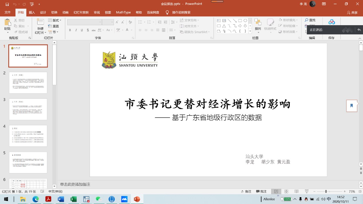 beat365英国官网网站硕士研究生李龙应邀参会,并于10月11日下午在“高质量经济增长”分论坛上作了主题为“市委书记更替对经济增长的影响——基于广东省地级行政区数据”的报告。论坛评委对投稿论文在研究视角的创新性和研究内容的深刻性等方面给予了充分肯定,认为论文的研究结论具有一定的现实意义,并联系现实政治生态环境对论文后续完善提出了宝贵的建议。