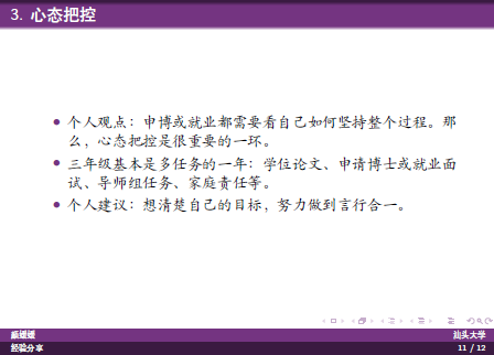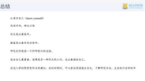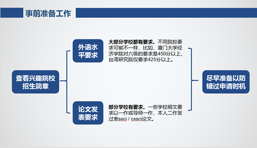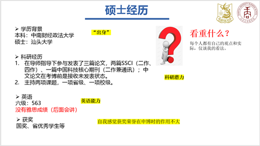 谢婧用从考博是什么,为什么考博,以及如何考,用思维导图进行全面直观地分析。学术训练、确定研究兴趣、学校选择、博导联系,备考等方面进行分析。特别勉励研一、研二的学生,接受各方面的学术训练,学会利用在校学习资源、科研项目,校内外会议讲座、暑期学校和训练营等对自己进行提升。