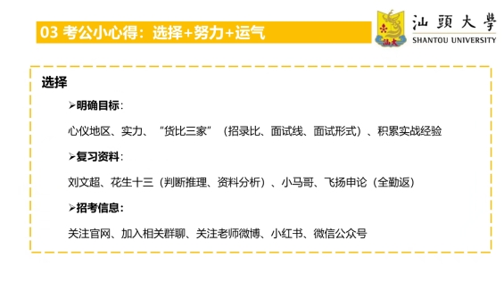 会计学2020级研究生赵文敏分享了自己考公经验,包括选岗、备考题型、备考过程、面试等,建议备考时反复练习薄弱题型,并可根据自己的学习情况调整做题顺序,平时多关注时政信息。