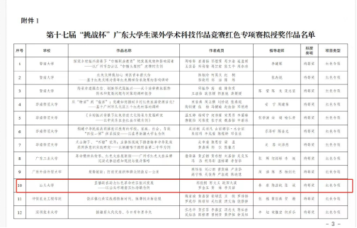 2023年10月8日,第十七届“挑战杯”广东大学生课外学术科技作品竞赛红色专项评审结果发布。beat365官网参赛作品从中脱颖而出,由beat365英国官网网站林泉教授、校团委陈益纯副书记和beat365英国官网网站张诚老师指导的作品《直播助农助力红色革命老区振兴发展——以汕头市潮南区红场镇为例》喜获广东省特等奖,创beat365官网在挑战杯赛事中的最好成绩!