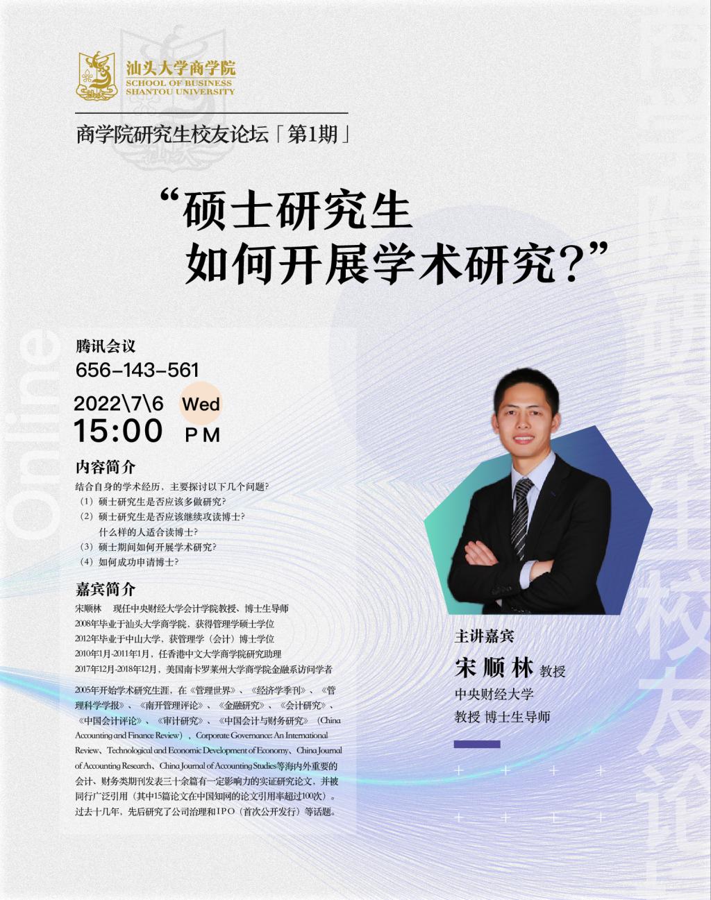宋顺林,现任中央财经大学会计学院教授、博士生导师。2008年毕业于beat365英国官网网站,获得管理学硕士学位;2012年毕业于中山大学,获管理学(会计)博士学位。2010年1月-2011年1月,任香港中文大学beat365英国官网网站研究助理;2017年12月-2018年12月,美国南卡罗莱州大学beat365英国官网网站金融系访问学者。2005年开始学术研究生涯,在《管理世界》、《经济学季刊》、《管理科学学报》、《南开管理评论》、《金融研究》、《会计研究》、《中国会计评论》、《审计研究》、《中国会计与财务研究》(China Accounting and Finance Review),Corporate Governance: An International Review、Technological and Economic Development of Economy、China Journal of Accounting Research、China Journal of Accounting Studies等海内外重要的会计、财务类期刊发表三十余篇有一定影响力的实证研究论文,并被同行广泛引用(其中15篇论文在中国知网的论文引用率超过100次)。过去十几年,先后研究了公司治理和IPO(首次公开发行)等话题。