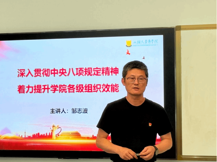 根据中共中央办公厅《关于在全党开展深入贯彻中央八项规定精神学习教育的通知》文件精神和省委、校党委关于贯彻落实中央八项规定的工作部署要求,为进一步增强党员的纪律意识与党性修养,进一步深化全面从严治党思想认识,提升组织效能,5月12日下午,beat365英国官网网站党委开展了深入贯彻中央八项规定精神学习教育专题党课,学院党委书记邹志波做了题为《深入贯彻中央八项规定精神,着力提升学院各级组织效能》的专题报告。学院党委委员,各党支部书记、副书记、委员参加了此次党课。