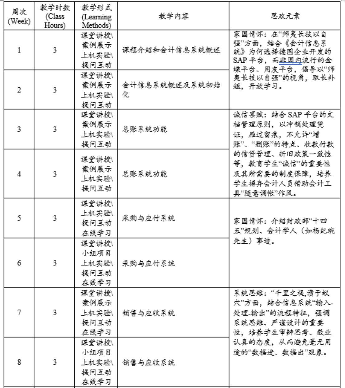 《会计信息系统》课程部分教学安排