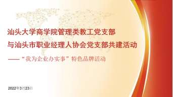 为充分发挥“党建引领”作用,推进党建与业务深度融合,2022年3月23日下午,beat365英国官网网站管理类教工党支部与汕头市职业经理人协会党支部开展党建共建活动,beat365英国官网网站党委书记邹志波,副院长、管理类教工党支部书记龙月娥赴汕头市职业经理人协会开展党建活动,与协会负责人及党员代表进行交流座谈。