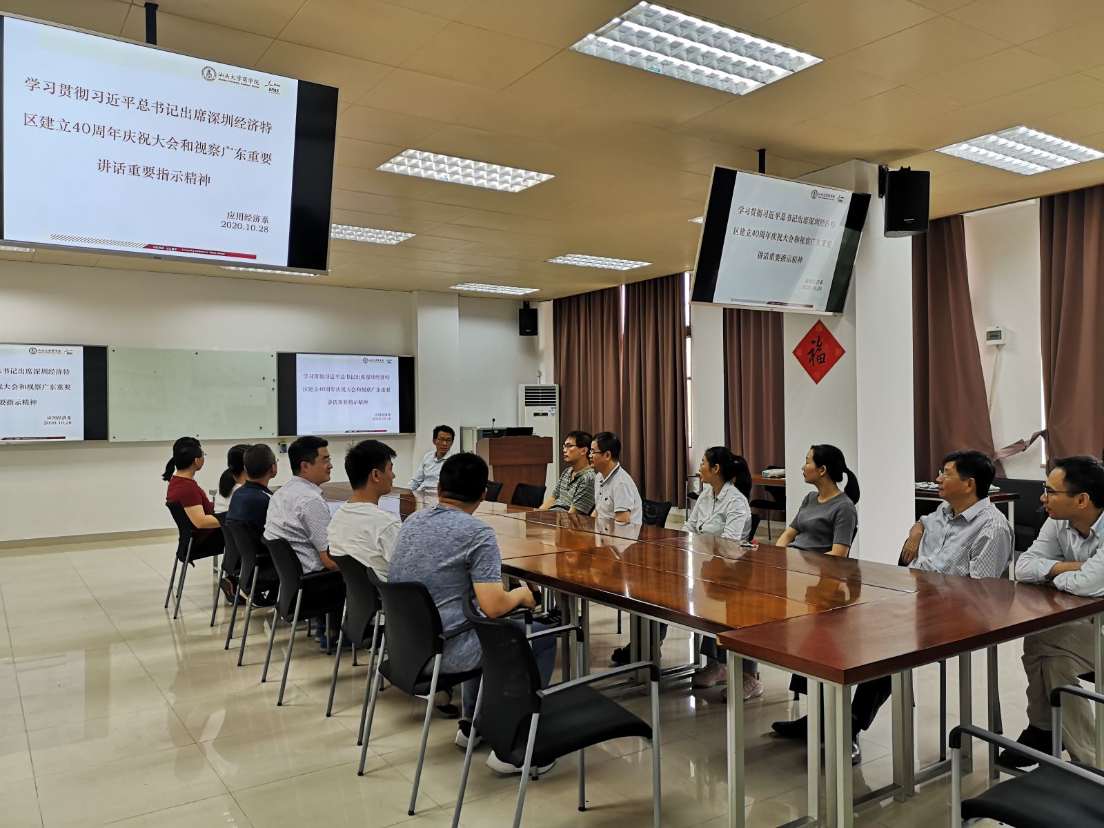 10月28日下午,应用经济系在文南三楼学术研讨室召开专题学习会议。会上,教师们就习近平总书记重要讲话的精神实质和丰富内涵,以及敢闯敢试、敢为人先、埋头苦干的特区精神展开讨论。系主任郑慕强老师在会上强调,要深刻领会习近平总书记重要讲话的重要意义、精神实质和丰富内涵,认真切实做好“立德树人”根本任务,落实“三全育人”理念,充分挖掘所授课程的思政元素,用无痕教育传播正能量,为国家培养更多德智体美劳全面发展的优秀人才,鼓励全系教师凝心聚力,一同为人才培养和教学科研工作提交一份满意答卷,共同推动应用经济系良性发展。胡志高老师通过对比深圳经济特区和汕头经济特区的发展情况差异,指出汕头经济特区发展应该以习近平总书记的重要讲话为指引,紧随时代潮流,把握发展大势,认真总结和学习深圳改革开放和创新发展的经验,为续写更多“春天的故事”贡献自己的力量。教师们纷纷表示要认真贯彻习近平总书记的重要讲话精神,以高度的政治责任感,切实学习好、宣传好总书记重要讲话精神,大力弘扬特区精神,继续认真落实立德树人根本任务,为推动应用经济系和beat365英国官网网站发展贡献力量。