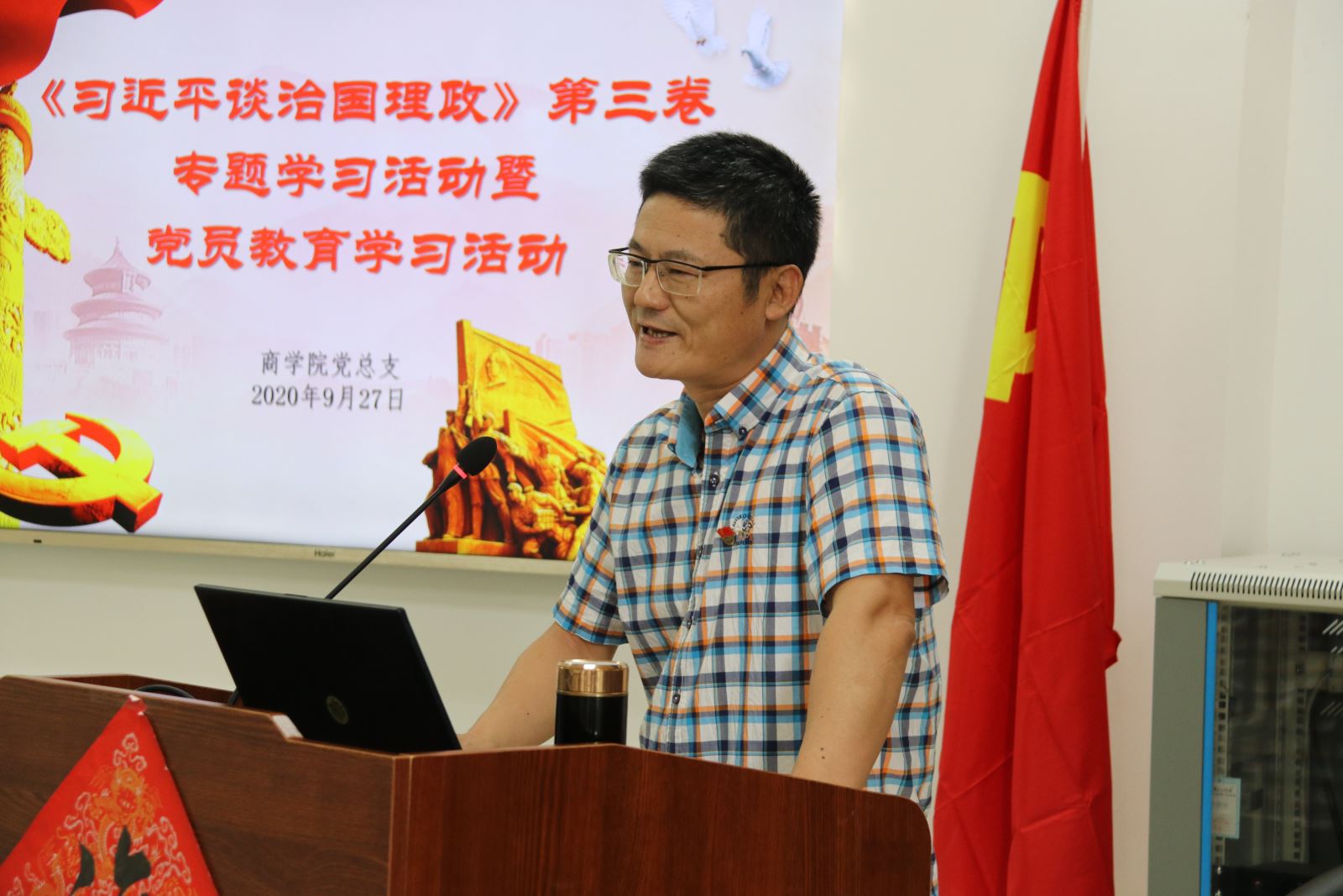 2020年9月27日下午,beat365英国官网网站党总支组织开展《习近平谈治国理政》第三卷专题学习暨党员纪律教育学习活动。beat365英国官网网站党总支全体党员、发展对象、入党积极分子参加学习。总支书记邹志波同志作了题为“新时代、新气象与新作为”的专题报告,希望在座人员要深入思考beat365英国官网网站如何在学科建设、学生培养、社会服务等方面有更大的新作为,要勇于担当和作为,以身作则,为学校和学院的发展做出应有的贡献。会上,与会人员学习了学校2020年beat365英国官网网站纪律教育学习月活动和师德建设主题教育月活动的文件精神,集体观看学习了全面从严治党专题教育片《淬炼》。
