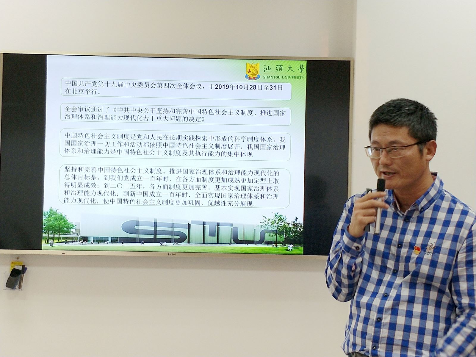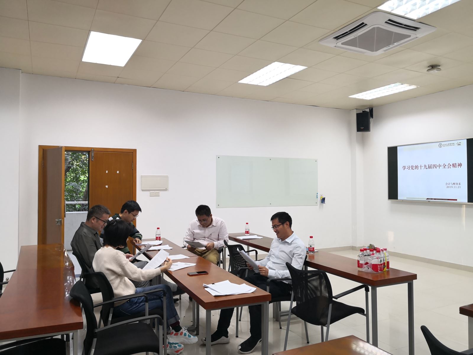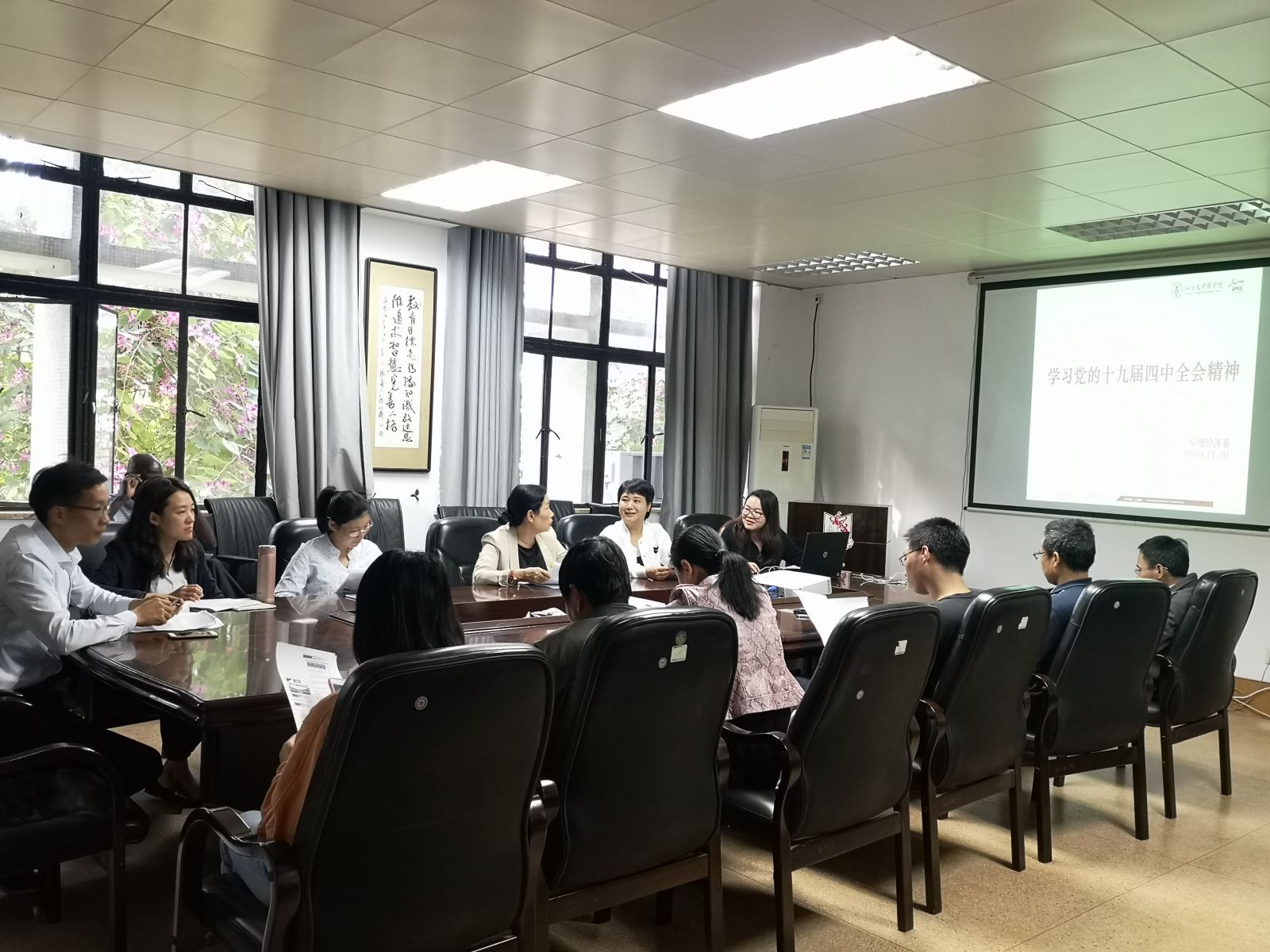 11月20日下午,应用经济系组织全体教师专题学习贯彻党的十九届四中全会精神和《新时代爱国主义教育实施纲要》文件精神。与会教师认真学习了《中国共产党第十九届中央委员会第四次全体会议公报》、《中共中央关于坚持和完善中国特色社会主义制度 推进国家治理体系和治理能力现代化若干重大问题的决定》和《新时代爱国主义教育实施纲要》等文件精神,并结合个人成长经历和工作经历围绕文件精神展开热烈讨论,进一步深入领会了党的十九届四中全会精神,并深刻领会到新中国取得伟大成就的根本原因和爱国主义教育的必要性。