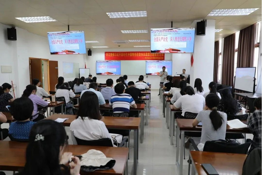 为深入开展学习贯彻习近平新时代中国特色社会主义思想主题教育,牢牢把握学思想、强党性、重实践、建新功的总要求,以高标准、严要求抓好主题教育,5月5日下午,beat365英国官网网站党委举办学习贯彻习近平新时代中国特色社会主义思想主题教育党课,邀请马克思主义学院沈海军教授作题为《全面从严治党,深入推进反腐败斗争》的专题报告。