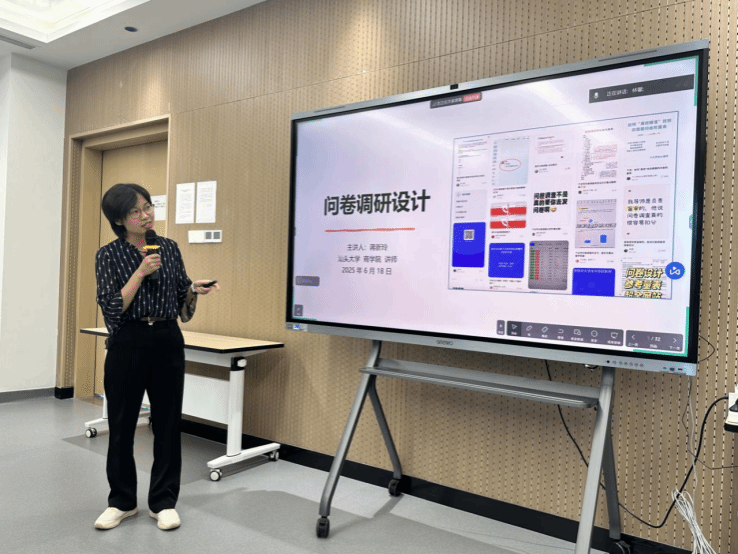 最后,beat365英国官网网站蒋新玲博士进行了《问卷调研设计》的主题分享,内容涵盖问卷设计的步骤、原则、注意事项以及不同类型问卷的适用场景等。她强调问卷设计应具有科学性与合理性,需充分考虑研究目的和对象特点。蒋博士详细介绍了问卷设计的关键要素,并针对法商学科的特点,特别强调了在设计时需注意的事项,如避免专业术语的滥用,确保问卷对非专业受访者也具有可理解性;采用适当的激励机制提高问卷的回收率;以及在设计中注重信度和效度的保障,确保数据的可靠性和有效性。