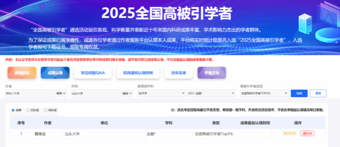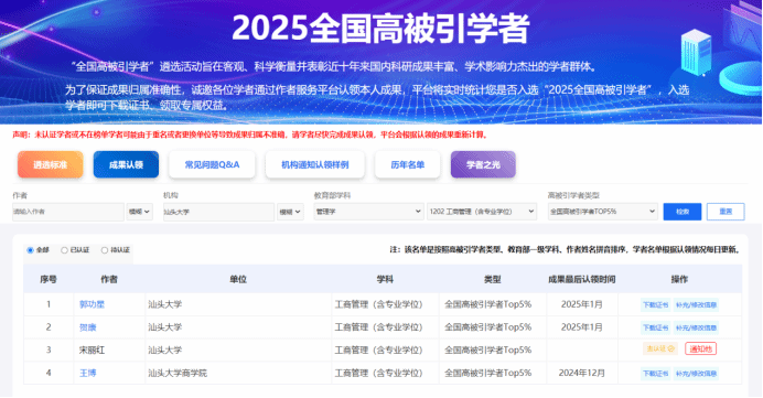 近日,中国知网下属的中国科学文献计量评价研究中心基于中国知网收录的国内学术成果,发布“2025全国高被引学者”名单,旨在客观、科学衡量并表彰近十年来国内科研成果丰富、学术影响力杰出的学者群体。