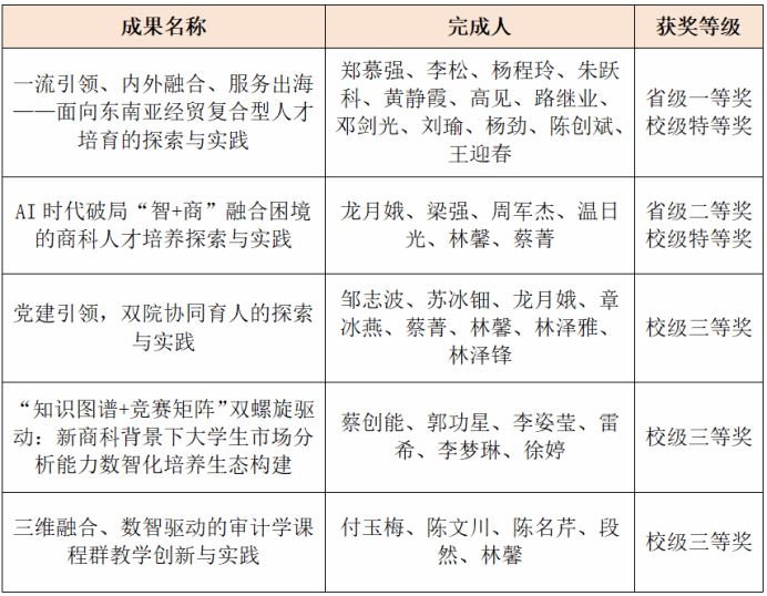 beat365官网两项教学成果脱颖而出,其中《一流引领、内外融合、服务出海——面向东南亚经贸复合型人才培育的探索与实践》(第一完成人:郑慕强;其他完成人:李松、杨程玲、朱跃科、黄静霞、高见、路继业、邓剑光、刘瑜、杨劲、陈创斌、王迎春)获省级一等奖,《AI时代破局“智+商”融合困境的商科人才培养探索与实践》(第一完成人:龙月娥;其他完成人:梁强、周军杰、温日光、林馨、蔡菁)获省级二等奖。