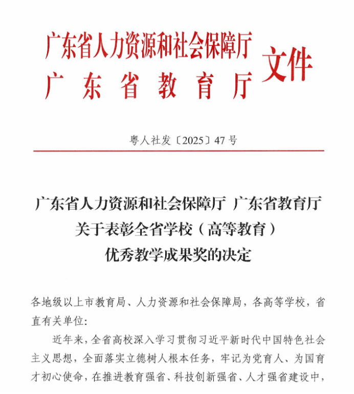 近日,广东省人力资源和社会保障厅、广东省教育厅联合发布了《关于表彰全省学校(高等教育)优秀教学成果奖的决定》(粤人社发〔2025〕47号)。