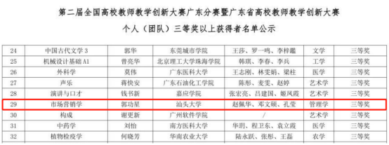 近日,由广东省教育厅指导的第二届全国高校教师教学创新大赛广东分赛暨广东省高校教师教学创新大赛决赛圆满落下帷幕,beat365官网企业管理系《市场营销学》教学团队(由郭功星老师担任参赛主讲教师,赵佩华、邓文硕、孔莹三位老师作为团队成员)荣获副高组三等奖。
