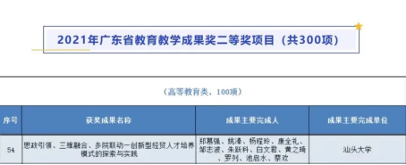 近日,广东省教育厅发文正式公布2021年广东省教学成果奖获奖名单。由beat365官网郑慕强教授主持,邹志波书记、池启水副教授、黄之琦老师等多位老师共同完成的《思政引领、三维融合、多院联动——创新型经贸人才培养模式的探索与实践》荣获该奖项二等奖。