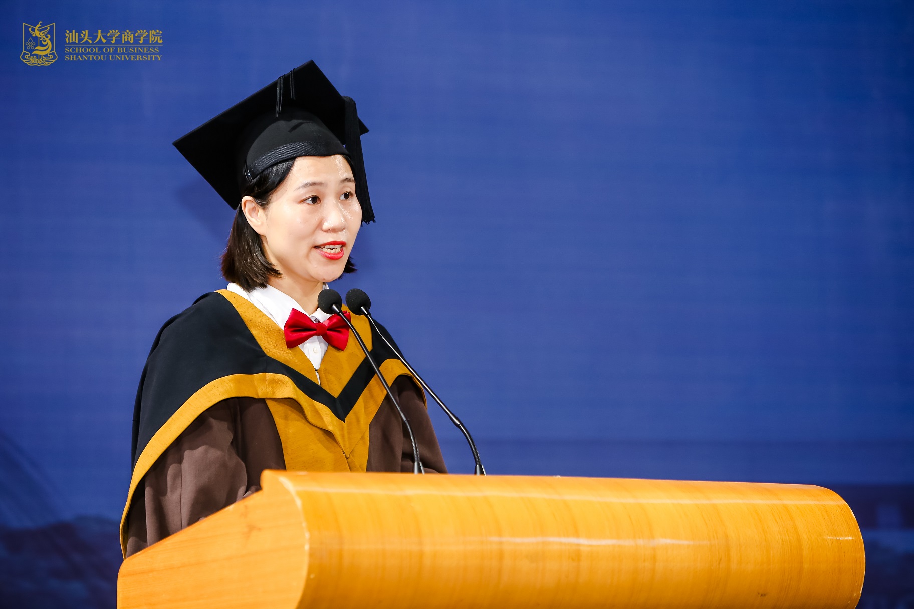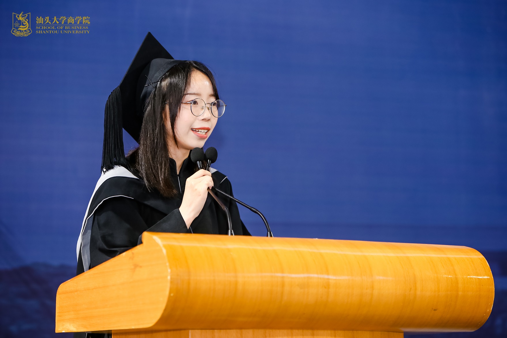 2018级会计学专业余倩倩同学作为本科毕业生代表发言。余倩倩同学分享了她大学四年的成长经历,感谢学校和学院赋予的资源和机会,感谢老师们提供的帮助与支持,让学生不断走出自己的舒适圈,做好迎接全新挑战的准备,勉励同学们在建立自我的过程中,追求无我,践行每个汕大学子应有的担当与使命。