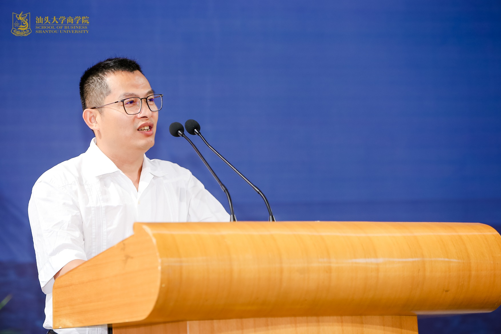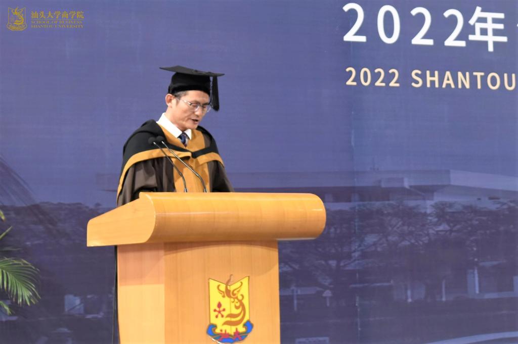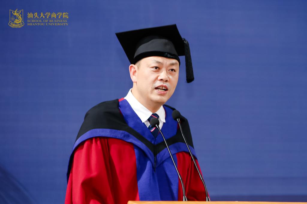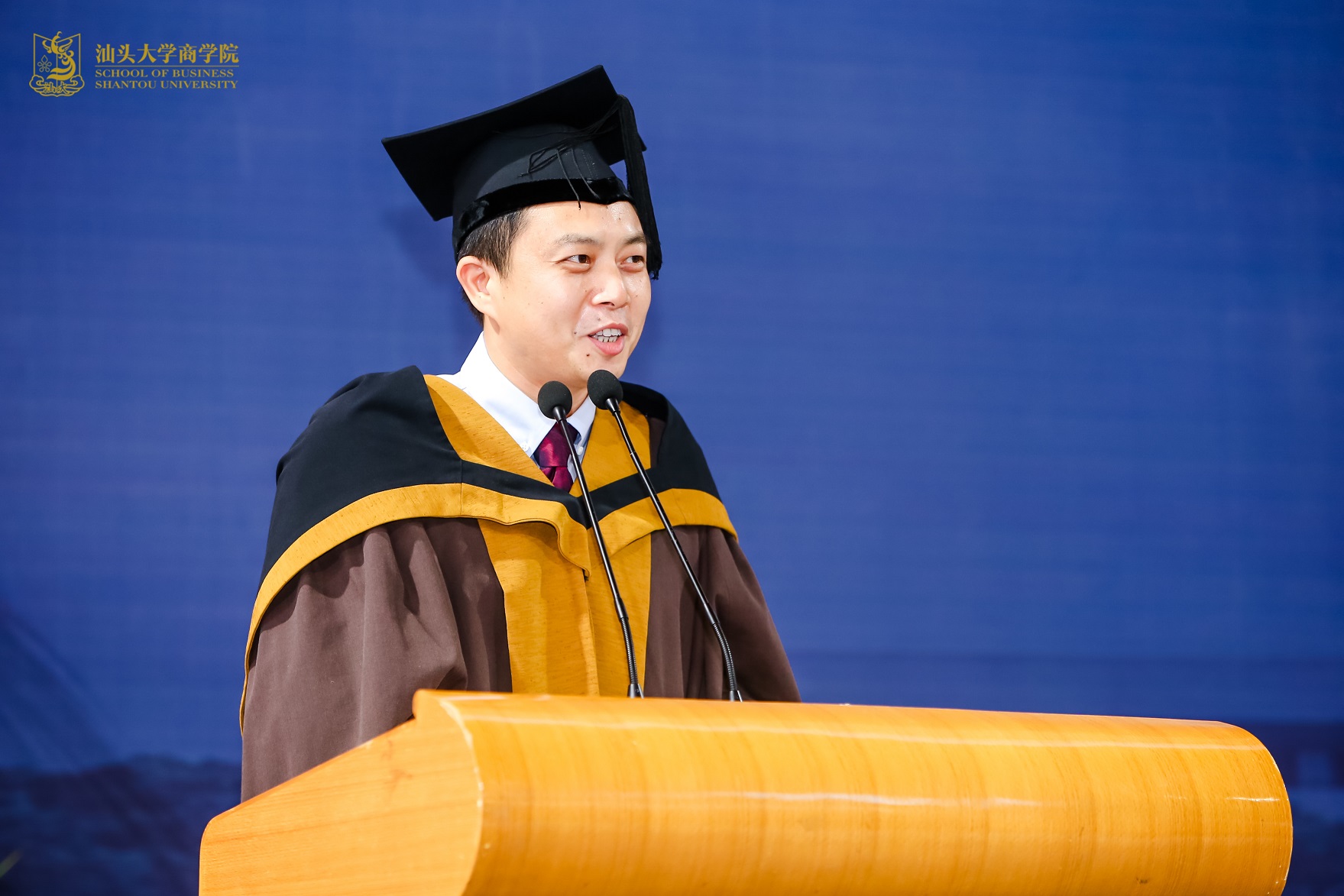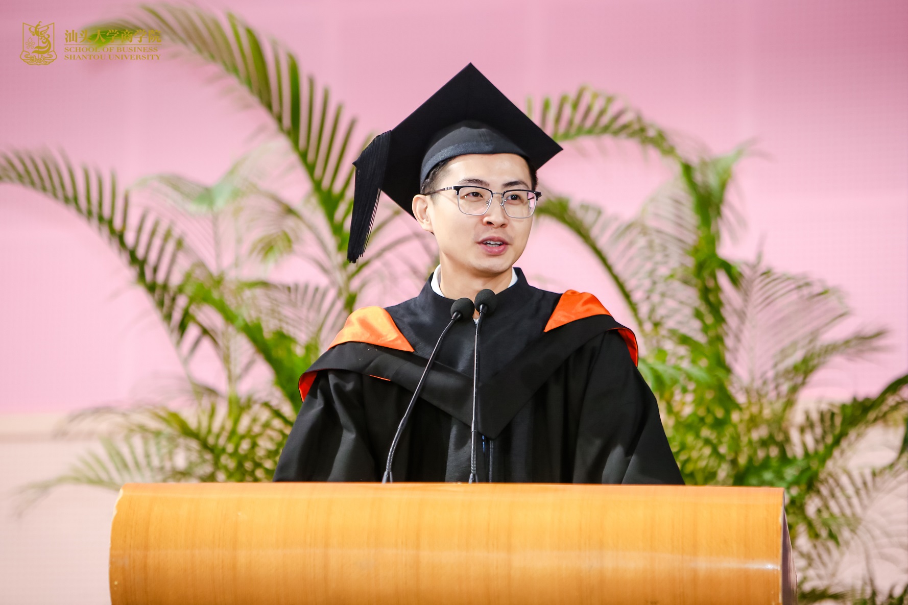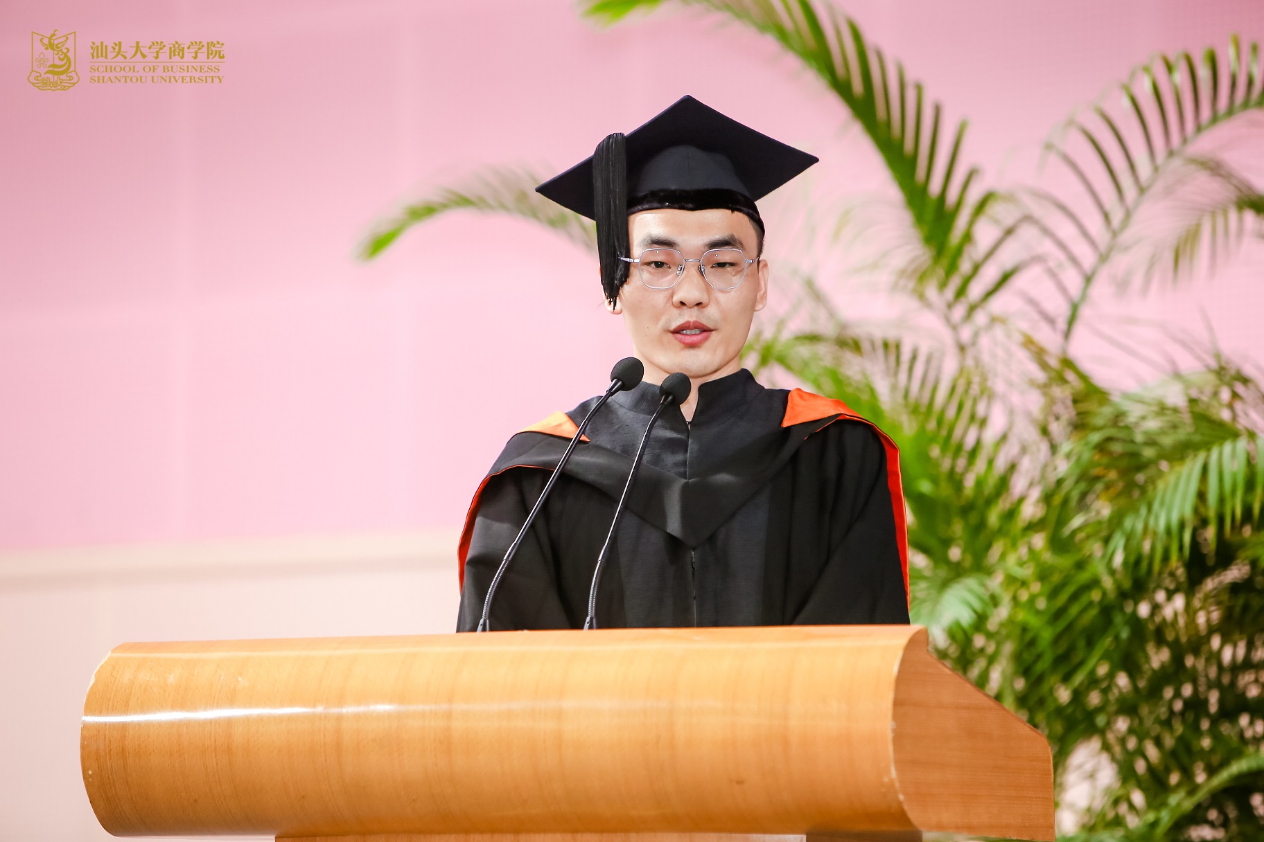 2019级会计学硕士专业郭春同学作为学术型硕士研究生毕业生代表发言。郭春同学分享了他在汕大七年本硕学习生涯的成长经历,感谢学校给了他们建立自我和超越自我的平台,感谢学院老师的悉心培养和传道授惑,为他们指引方向和开拓思维,勉励同学们立志做“有志、有识、有恒、有为”的“四有”青年。