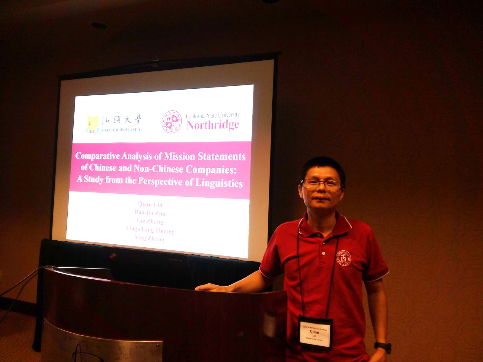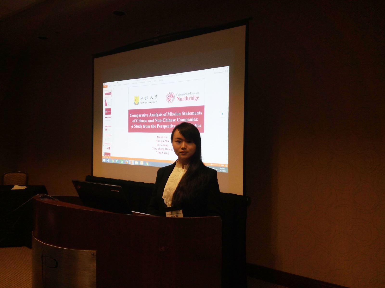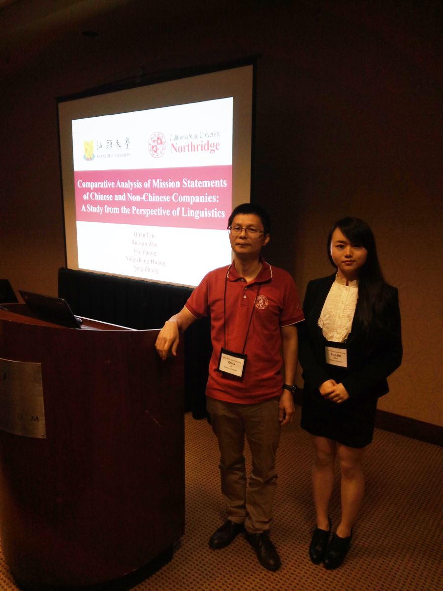 我校林泉教授等与其合作者——加州州立大学北岭分校(California State University, Northridge,简称CSUN)的Jeff Zhang教授共著了战略管理方向的一篇论文,并投稿至西部决策学会,文章成功被该学会接受,并随即收到该学会的年会邀请。根据会议议程,师生二人于太平洋时间4月7日下午3点与来自世界各地其它高校的师生探讨了其论文“Comparative Analysis of Mission Statements of Chinese and Non-Chinese Companies: A Study from the Perspective of Linguistics”。首先,朱若瑾同学对论文进行了详细的讲解。其后,有两位学者分别就研究方法和样本选择进行了提问。师生对所提问题依次进行了解答,同时,也基于这些问题,发现了自己论文的不足。
