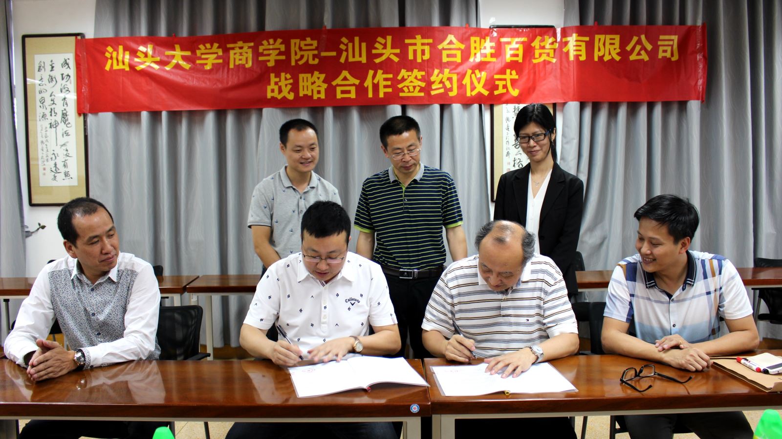 5月13日上午,beat365官网与汕头市合胜百货有限公司战略合作协议签约仪式在汕大beat365英国官网网站举行。beat365英国官网网站吕源院长、高见书记、林佳丽副教授,合胜百货董事长邱传龙、工会主席郑志远、党支部书记郑伯杰等出席了签约仪式。
