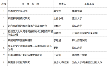 为建设全国东南亚(泰国)潮商研究高地,在学术研究、政策研究、咨询服务等方面实现突破,把东南亚经济(潮商)、泰国国别研究、东南亚华文教育研究作为特色。在beat365英国官网网站科研处、发展规划处等部门支持下,beat365英国官网网站东南亚研究中心开放课题发布后,境内外多所高校学者积极申报,共收到申报书15份,经过资格审核、专家评审,共有8个项目通过评审,获得立项。