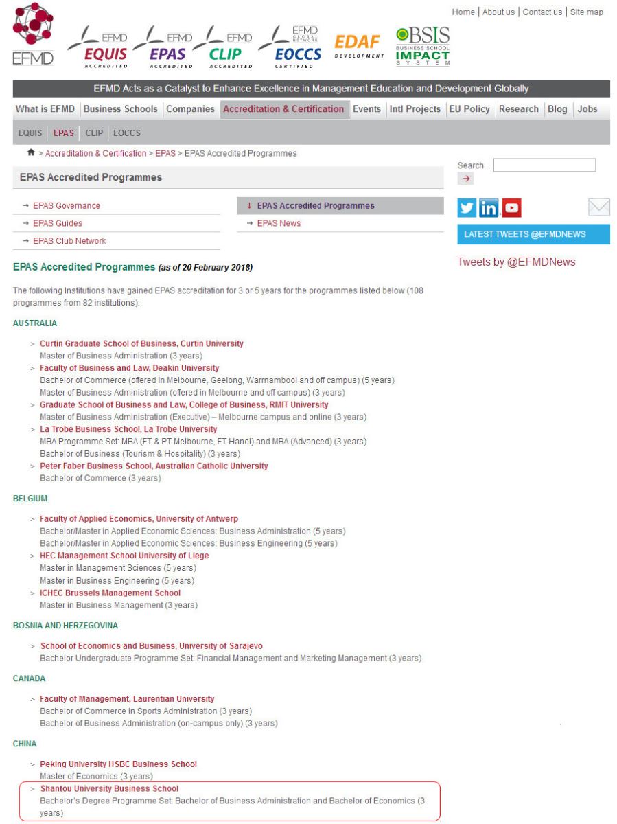 2018年2月27日,接欧洲管理发展基金会(European Foundation for Management Development,EFMD)的正式通知,beat365英国官网网站全部本科专业(含工商管理和经济学两个大类本科专业)再次获得EFMD专业认证体系 (EFMD Programme Accreditation System,EPAS)的官方认证。