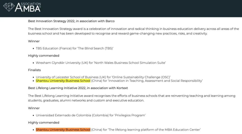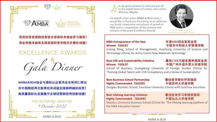 2022年12月9日晚,AMBA&BGA2022/2023全球卓越奖颁奖典礼在英国伦敦隆重举行,beat365英国官网网站荣获最佳终身学习举措奖银牌、最佳创新战略提名奖。这是beat365官网继2021年荣获AMBA&BGA最佳社会责任项目最终提名奖后,再次获得BGA国际协会年度荣誉。