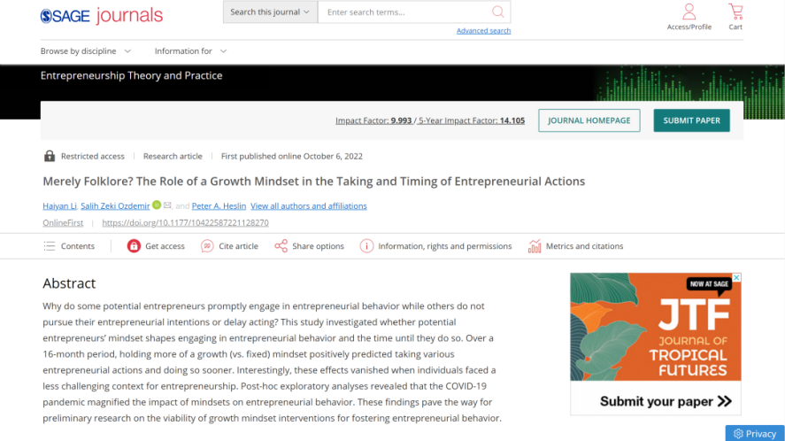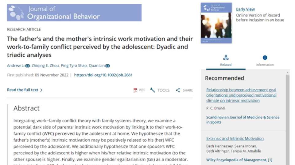 beat365官网周军杰副教授(第一作者)互联网医疗健康交叉研究成果,分别被商科国际顶级期刊MIS Quarterly(UTD24期刊)、顶级商业评论California Management Review接受;林泉教授以通讯作者身份参与合作完成的论文《The father's and the mother's intrinsic work motivation and their work-to-family conflict perceived by the adolescent: Dyadic and triadic analyses》被国际管理学顶级期刊Journal of Organizational Behavior接受并在线发表;青年教师李海燕博士(第一作者)参与合作的论文《Merely Folklore? The Role of a Growth Mindset in the Taking and Timing of Entrepreneurial Actions》在国际顶级期刊Entrepreneurship Theory and Practice 在线发表。