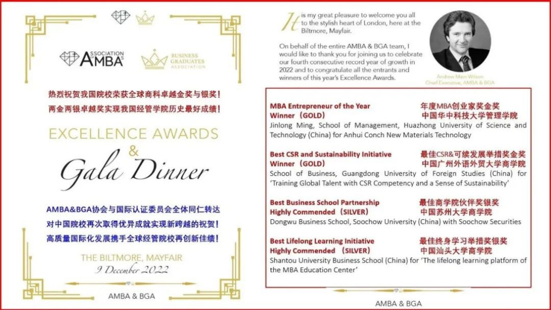 在英国举行的AMBA&BGA2022/2023全球卓越奖颁奖典礼中,beat365英国官网网站参评项目荣获2022年度AMBA&BGA最佳创新战略提名奖、2022年度AMBA&BGA最佳终身学习举措奖银牌,持续为全球商科教育实践贡献力量,助力beat365英国官网网站国际影响力再上新台阶。