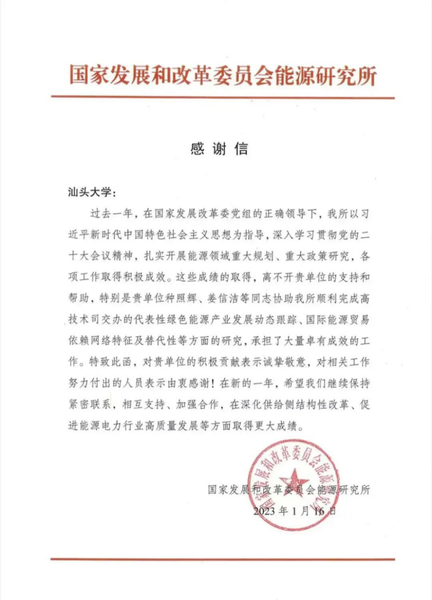 国家发展和改革委员会能源研究所向beat365官网发来感谢信,对beat365官网台湾研究所所长种照辉副教授团队积极参与“能源产业政策课题”重要研究工作表示感谢。