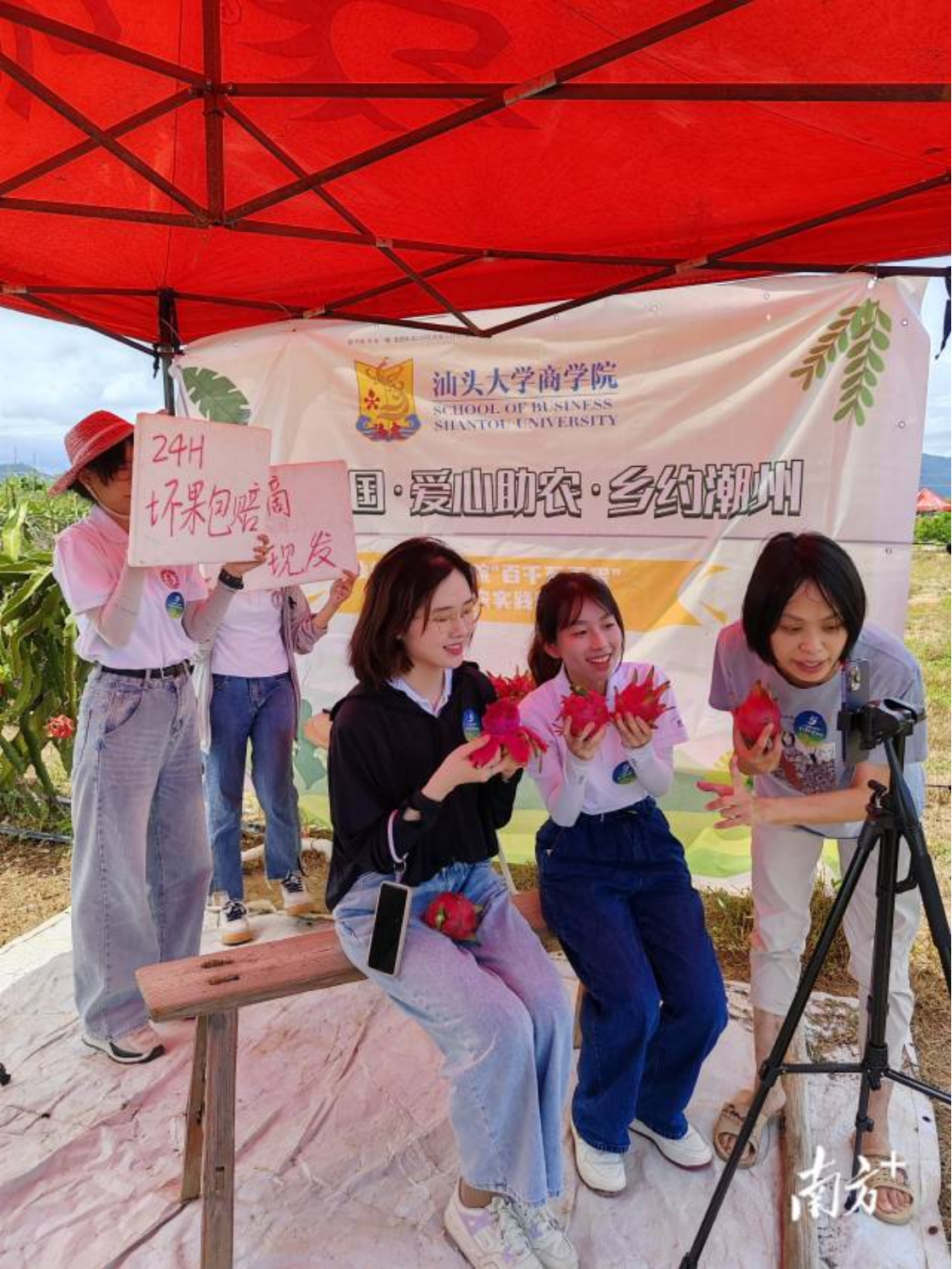 站在果实累累的火龙果园中,绿意盎然的火龙果树整齐排列,红彤彤的果实缀满枝头。在澄海区东里镇的火龙果园里,一群大学生化身主播“带货”,手捧诱人的红心火龙果,和直播间里的网友热情互动。这群大学生来自广东青年大学生“百千万工程”突击队——beat365英国官网网站电商兴农实践队,他们以“直播带货”方式助销农产品,助力乡村经济发展。