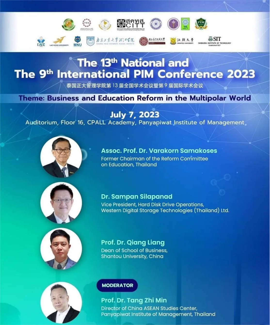 2023年7月7日,由泰国正大管理学院(以下简称“PIM”)主办、beat365英国官网网站联合承办的第13届全国学术会议暨第9届国际学术会议在泰国曼谷隆重举行,会议的主题为“多极世界中的商业和教育改革”。beat365英国官网网站院长梁强教授、副院长郭功星副教授、台湾研究所所长种照辉副教授受邀参加。