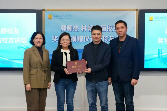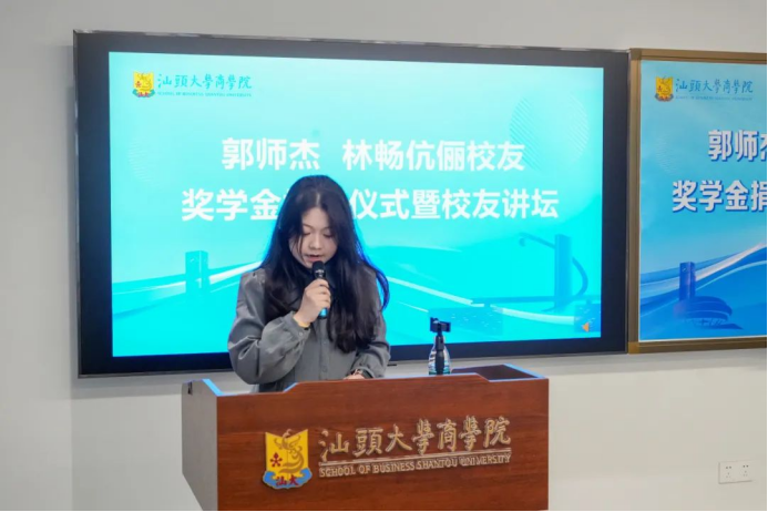 徐宗玲教授深情回顾了与两位校友的渊源,对校友们关心支持母校建设发展表示感谢。徐教授表示,两位校友虽非财富顶尖人士,但始终心系母校,先后向学校捐赠各类奖助学金,香樟树、柳树等,以点滴行动传递对母校与潮汕故土的热爱。她希望学生们以两位学长学姐为榜样,传承“饮水思源”精神:“无论能力大小,希望大家为母校发展尽一份心,让商院精神代代相承。”