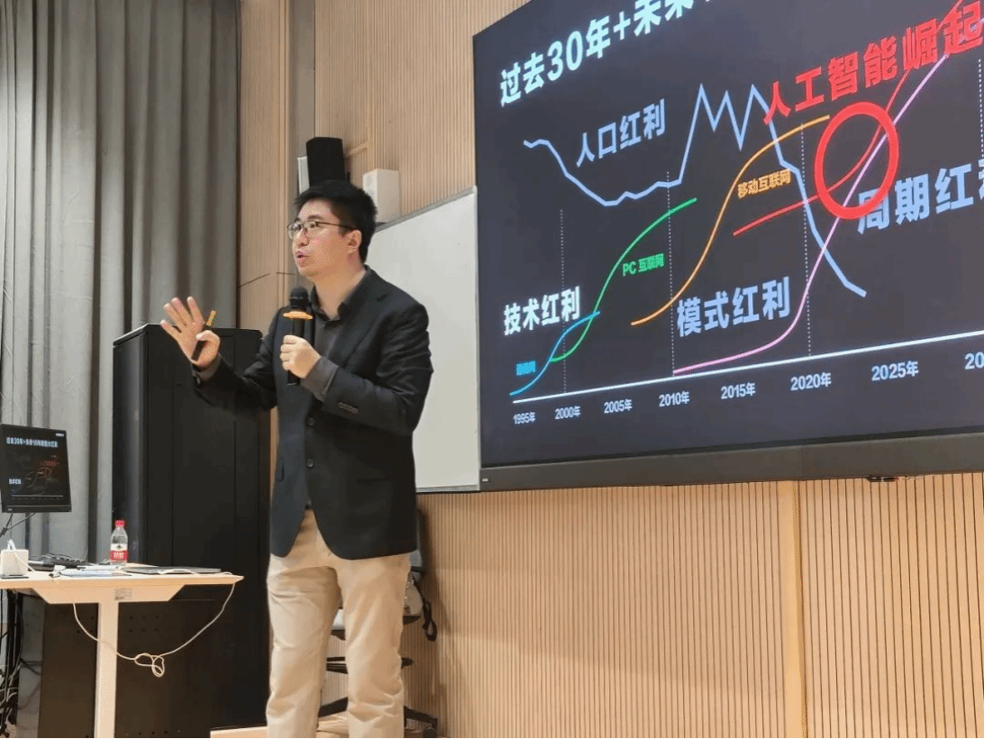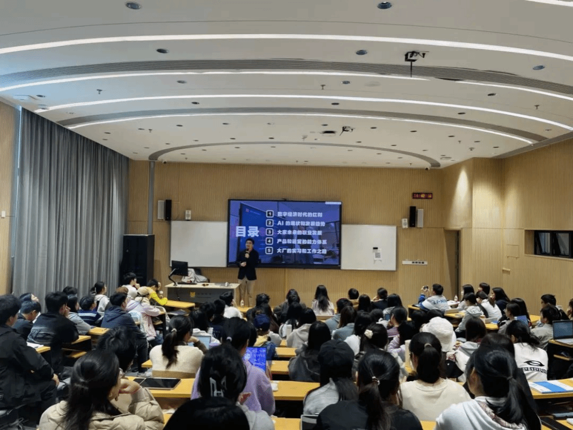 随后马老师通过类比工业革命时期的新质生产力,强调了大家未来的职业发展应当和人工智能、数字经济等新质生产力相挂钩。同时他借助了产品经理和产品运营这两个职业所需要具备的能力体系向同学们展示了大学时期要注重提升的个人能力。