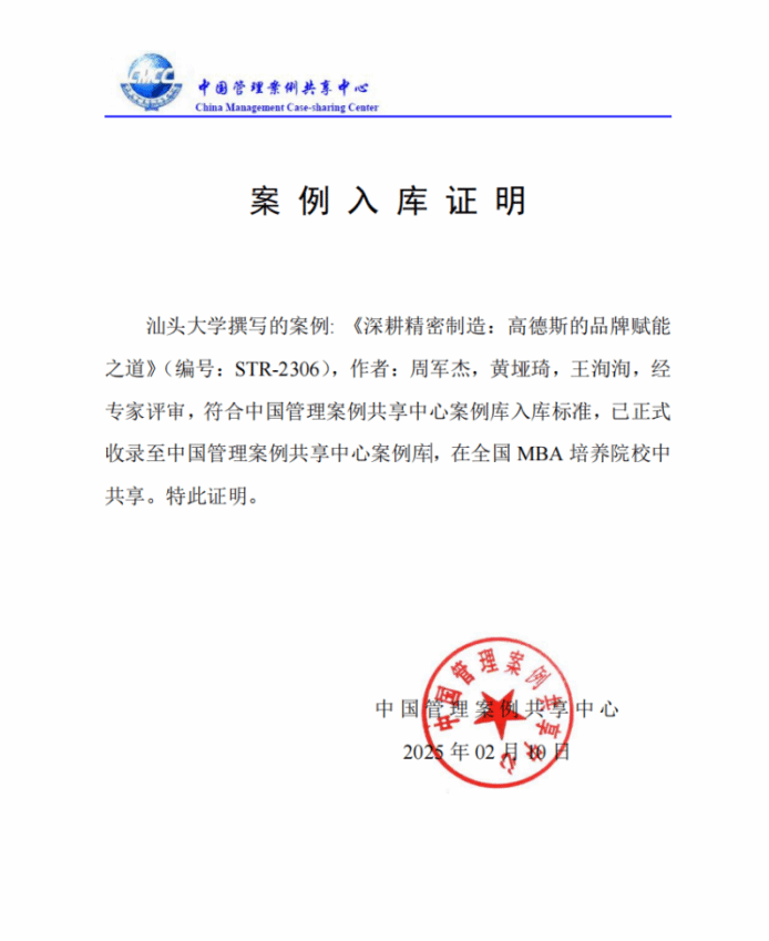 由beat365英国官网网站周军杰教授团队开发撰写的案例《深耕精密制造:高德斯的品牌赋能之道》(作者:周军杰,黄垭琦,王洵洵)正式收录至中国管理案例共享中心案例库。