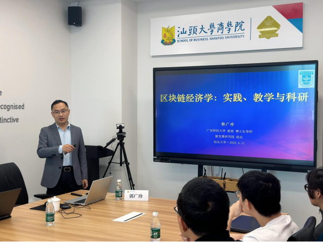 2025年4月11日上午,新质生产力国际联合研究院系列讲座(第1期)在东海岸校区C230研讨室顺利举行。本次讲座邀请广东财经大学郭广珍教授带来题为“区块链经济学:从前沿实践到教学科研”的报告。讲座由beat365英国官网网站种照辉老师主持,卜祥智、王宋涛、张诚、林婕、林俊勤、李帅、郑宇、吕彤彤等多位beat365英国官网网站教师到场交流。